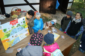 W czasie gdy ornitolog Bartosz Smyk w chacie edukacyjnej prezentował dorosłym jakie gatunki ptaków występują w Dolinie Baryczy oraz jak należy je rozpoznawać , Zofia Pietryka prowadziła zajęcia dla najmłodszych z wykorzystaniem pomocy edukacyjnych. Dzieci poprzez zabawę poznawały zwierzęta występujące w Dolinie Baryczy. Dużo radości i uśmiechów na buźkach wywołała zabawa z kolorowymi pacynkami : karpiem Milusiem , nietoperzem Cieszkiem, bocianem Przygodkiem , żmiją Grodką oraz bajkową postacią Grabkiem, który opowiadał dzieciom ciekawe historie. Przygotowaniem do wyjścia w teren, było oglądanie planszy „Cztery pory roku nad stawem”. Dzieci opowiadały o tym, jakie zmiany zachodzą w przyrodzie i jakie ptaki możemy spotkać jesienią a potem jeszcze pomalowały ryciny a jedna z mam przeczytała książkę „ O czym szumi tatarak” i już można było wyruszyć na podglądanie przyrody.