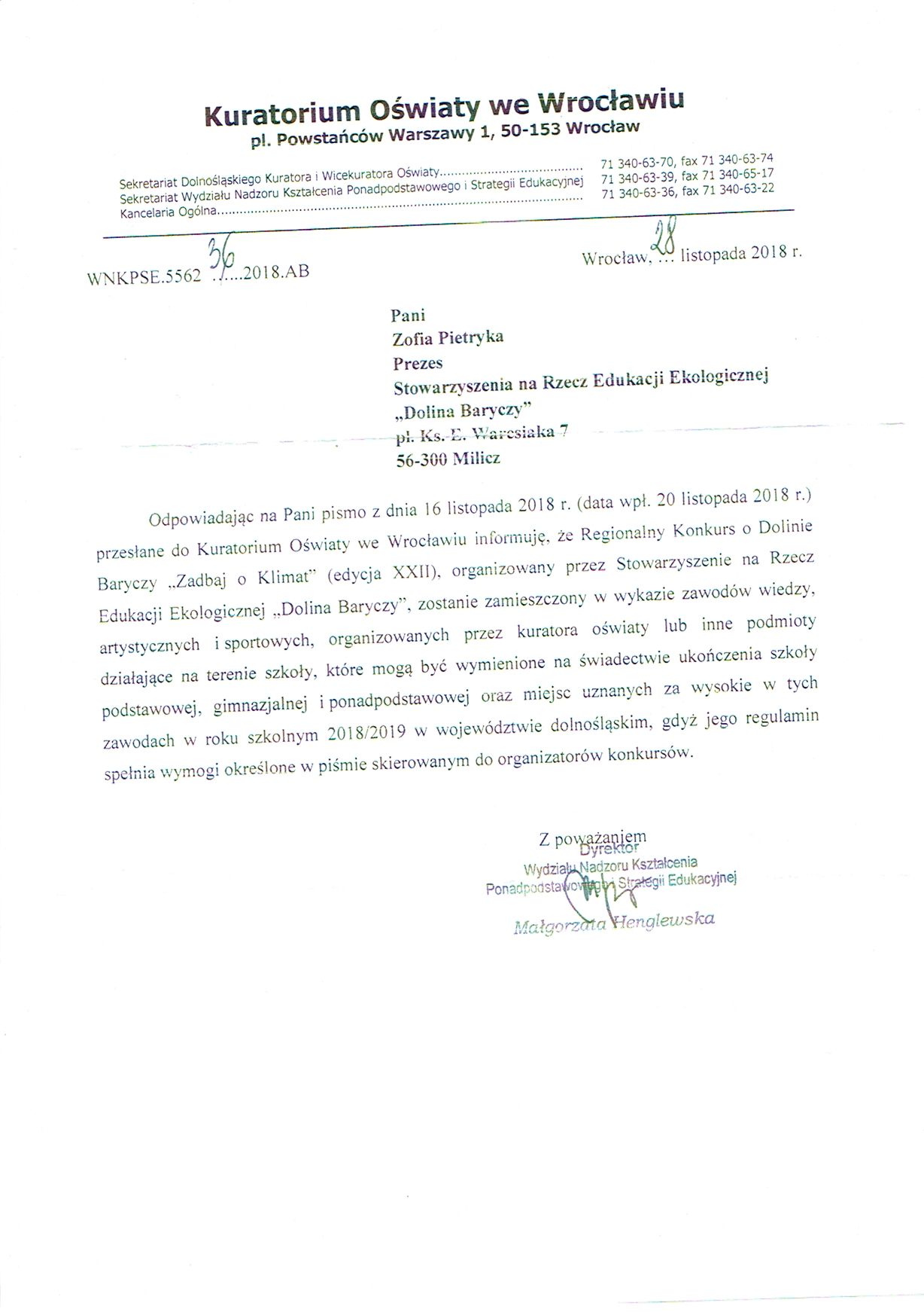 w związku z rekrutacją do szkół ponadgimnazjalnych i ponadpodstawowych na rok szkolny 2019/2020 w województwie dolnośląskim i wielkopolskim.ZAPRASZAMY! Zespół Organizacyjny Konkursu: Stowarzyszenie na Rzecz Edukacji Ekologicznej „Dolina Baryczy’ - nauczyciele przyrodnicy i historycy. Informacji udziela: Zofia Pietryka tel. 606 316 128 lub 698 469 574
